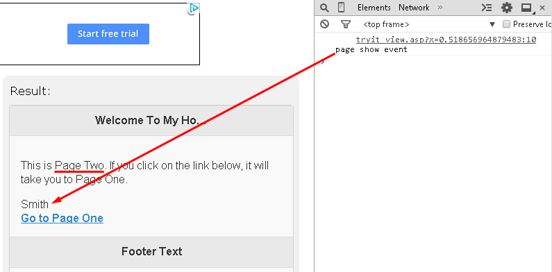 1.4) Masukkan kod untuk kesan PageShow events dan papar respon dalam Console Window